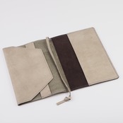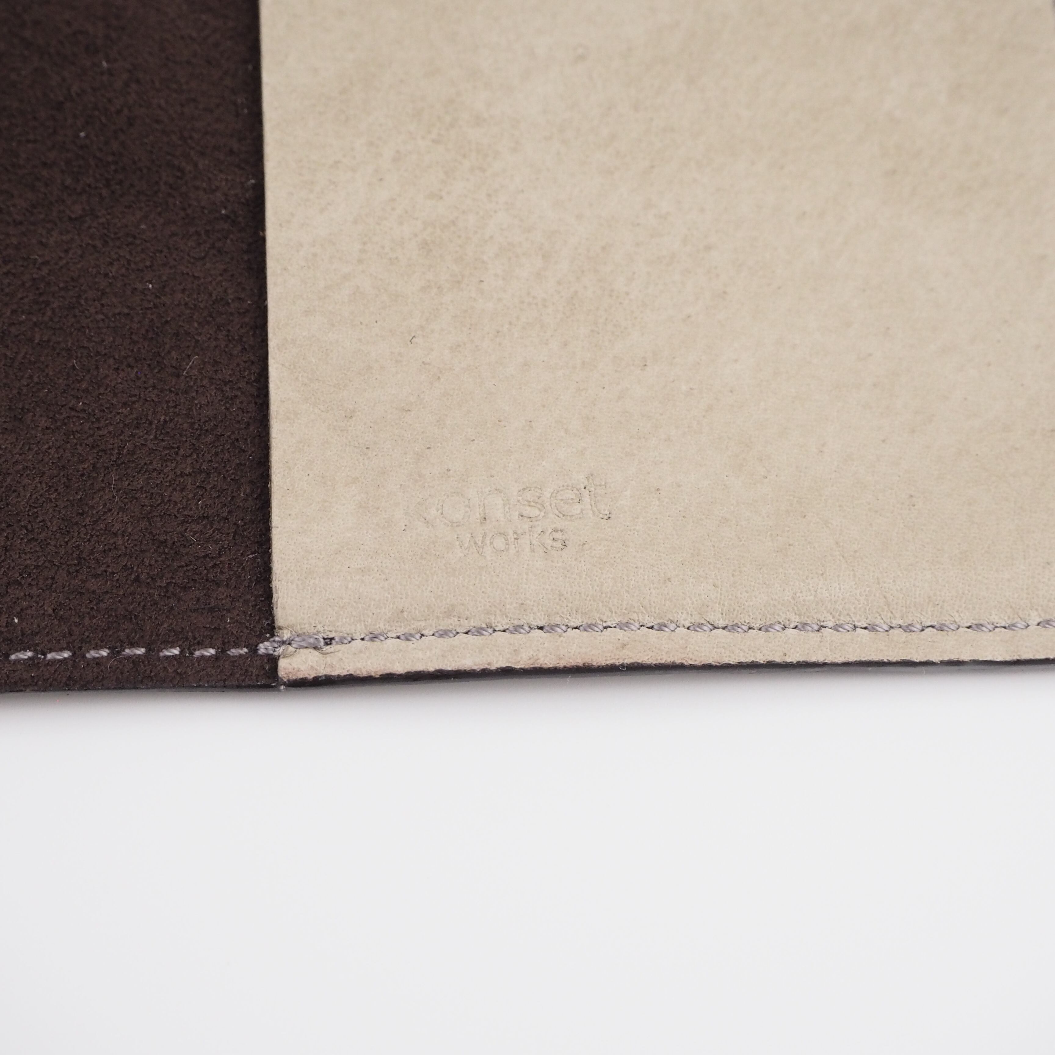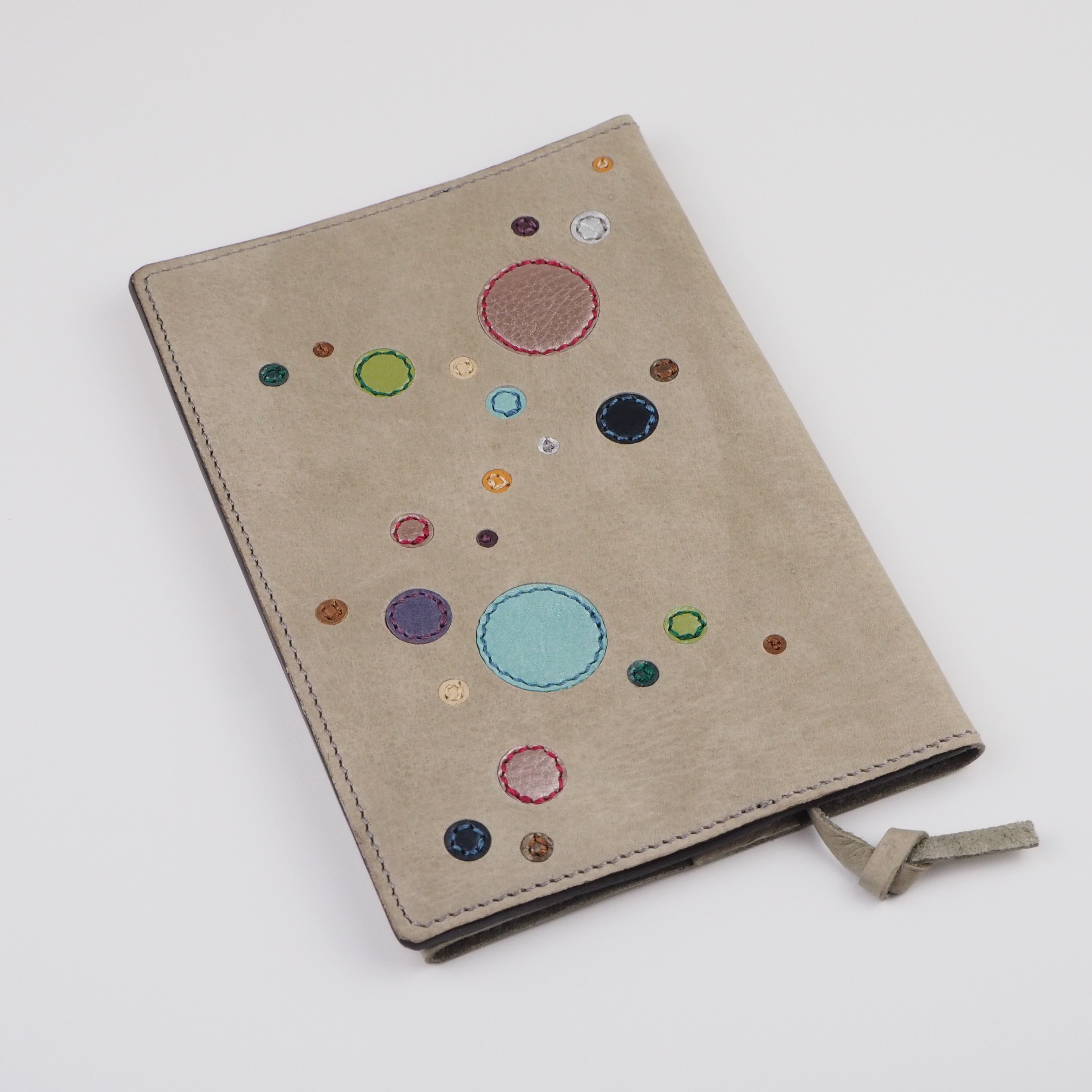 マットなグレーのレザーに、様々な色や質感の丸いレザーを模様にしたポップな見た目のブックカバー。