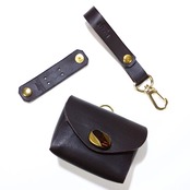 イヤホンのコードをまとめるホルダーと、それを収納するケース、カバンのハンドル等に取り付けるケースホルダーのセットです。