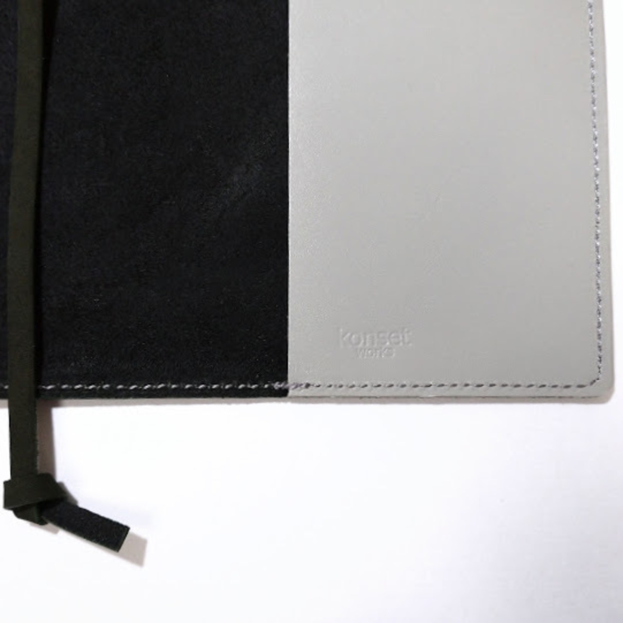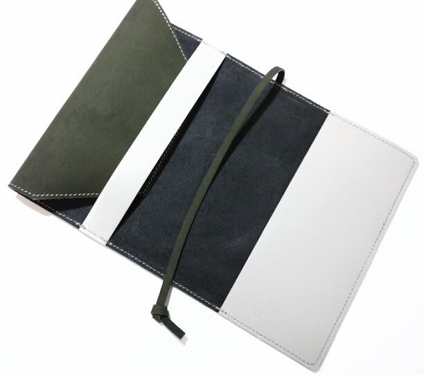 表は起毛タイプのモスグリーン(渋めの深緑)のレザー、内側はグレーのレザーを使用。
