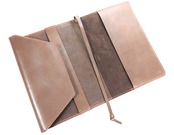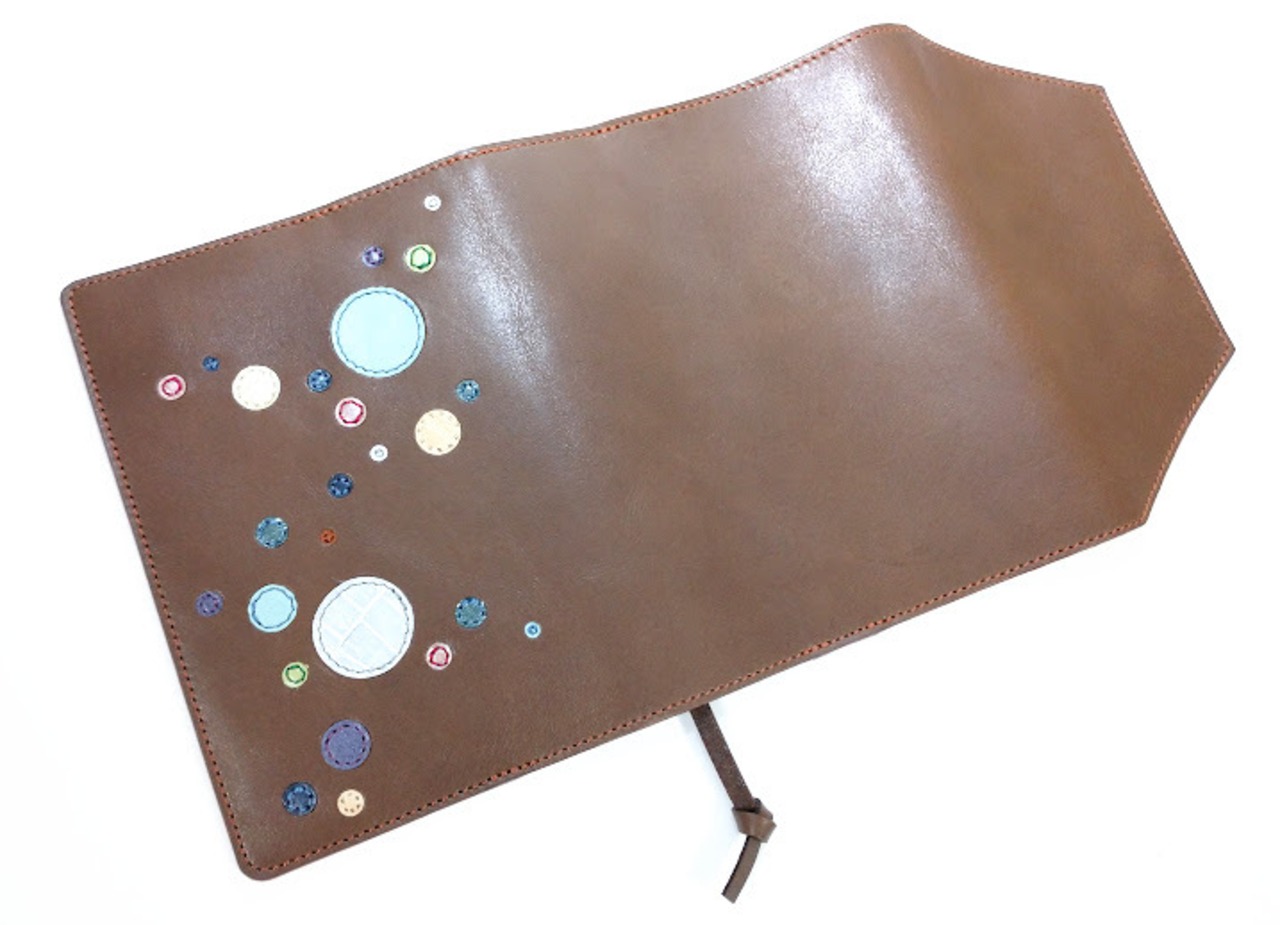 やわらかいブラウンのオイルレザーに、様々な色や質感の丸いレザーを模様にしたポップな見た目のブックカバー。